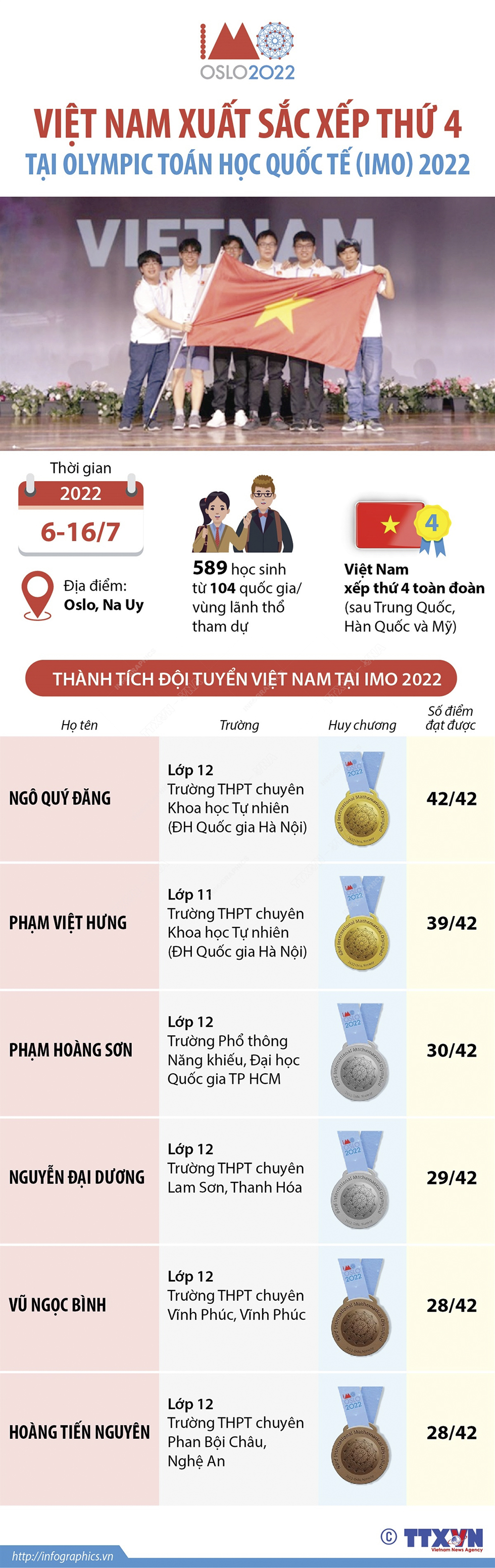 6 học sinh Việt Nam đã giành 2 huy chương Vàng, 2 huy chương Bạc và 2 huy chương Đồng cuộc thi Olympic Toán học quốc tế (IMO) 2022. Thành tích cá nhân của các học sinh giúp đội tuyển IMO Việt Nam xếp thứ 4 toàn đoàn, sau Trung Quốc, Hàn Quốc và Mỹ. Kỳ thi Olympic Toán quốc tế (IMO) 2022 được tổ chức trực tiếp tại Oslo (Na Uy) từ ngày 6-16/7/2022, sau 2 năm phải tổ chức trực tuyến do COVID-19.