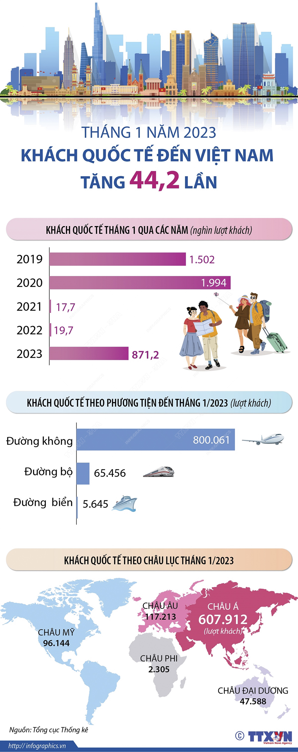 Khách quốc tế đến Việt Nam tháng 1 năm 2023 đạt 871,2 nghìn lượt người, cao gấp 44,2 lần cùng kỳ năm 2022 do Việt Nam đã mở cửa du lịch, các đường bay quốc tế được khôi phục trở lại. Tuy nhiên, khách quốc tế trong tháng 1 năm nay vẫn giảm 42% so với cùng kỳ năm 2019, năm chưa xảy ra dịch COVID-19.