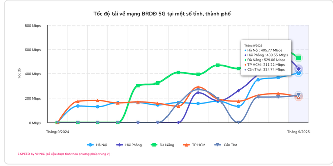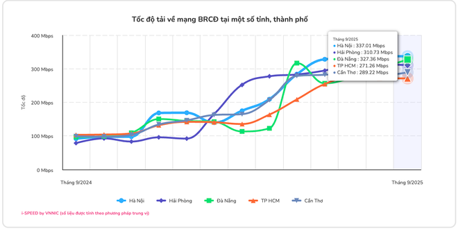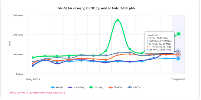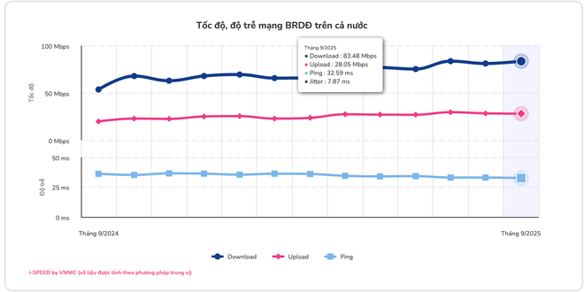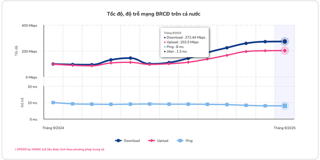 Theo số liệu mới nhất từ nền tảng đo tốc độ i-Speed (thuộc Trung tâm Internet Việt Nam - VNNIC, Bộ Khoa học và Công nghệ), trong tháng 9/2025, tốc độ tải xuống trung bình của mạng băng rộng cố định trên cả nước đạt 272,44 Mbps và tốc độ tải lên đạt 202,05 Mbps. Đây là tháng thứ 7 liên tiếp chất lượng mạng 'lập đỉnh' kể từ nhịp tăng hồi tháng 3/2025.