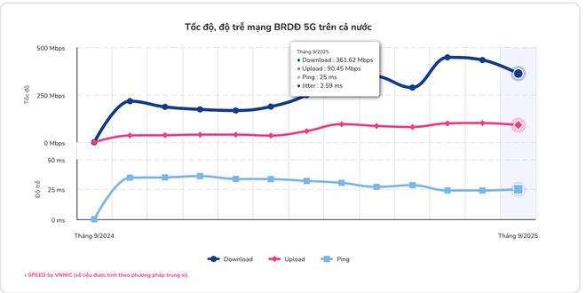 Trong tháng 9/2025, chất lượng mạng băng rộng di động 5G trên toàn quốc ghi nhận mức sụt giảm nhẹ so với tháng trước đó với tốc độ tải xuống đạt 361,62 Mbps và tốc độ tải lên trung bình đạt 90,45 Mbps.