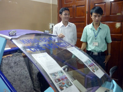 | Hai thành viên nhóm nghiên cứu và mô hình xe hybrid chạy xăng- điện. (Ảnh: P. T) |