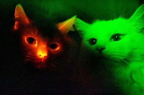 Năm 2007, các nhà khoa học Hàn Quốc đã nhân bản vô tính một chú mèo, và hơn nữa còn làm cho chú ta phát ra ánh sáng đỏ đưới đèn cực tím. Chú mèo được được tạo ra bằng cách cấy những phân tử protein huỳnh quang đỏ vào DNA nhân bản rồi đưa chúng vào trứng, sau đó cấy trở lại những trứng này cho mèo mẹ. Trong hình, chú mèo đặc biệt này (bên trái) phát ra ánh sáng đỏ trong phòng tối, trong khi một chú mèo trắng bình thường phát ra màu xanh dưới ánh đèn cực tím). Công trình này của họ sẽ giúp cải thiện các nghiên cứu về một số bệnh di truyền ở người.