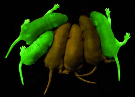 Các nhà nghiên cứu tại Đại học Pennsylvania đã tìm ra cách duy trì và nuôi dưỡng những tế bào gốc tạo tinh trùng từ những con chuột phát quang biến đổi gen. Trong ảnh là 3 chú chuột con phát quang nhờ protein huỳnh quang nhận từ chuột bố; chuột bố trước đó đã được cấy những tế bào gốc tạo tinh trùng có nhiễm huỳnh quang từ một con chuột phát quang khác. Nhóm nghiên cứu này đã cấy những tế bào gốc đặc biệt này vào những con chuột bị vô sinh, và kết quả là cho ra đời những chú chuột chuột con màu xanh lục đặc biệt này.