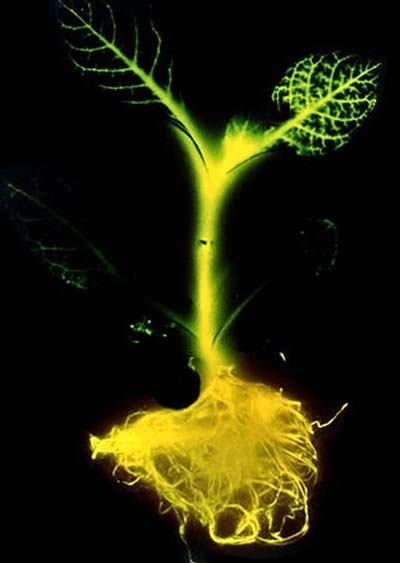 Năm 1986, các nhà khoa học tại trường Đại học Iowa đã cấy một cấu trúc gen của loài đom đóm vào cây thuốc lá, và kết quả ta có một cây thuốc lá phát sáng như trong ảnh. Không giống ánh sáng phát ra do protein huỳnh quang, ánh sáng lấy từ đom đóm này – có được nhờ chất nhuộm màu luciferin và enzyme luciferase – không đòi hỏi đến ánh sáng cực tím để phát quang, tuy nhiên chúng cần đến oxy để có thể phát sáng.
