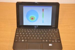| Máy quét di động dựa trên công nghệ tần số vô tuyến có thể hiện thị sự hiện diện khối u vú lành tính (màu đỏ) hay ác tính trên máy tính. |
