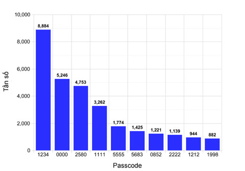 Từ 204.508 máy iPhone, tác giả tổng hợp được bảng số liệu sau thể hiện 10 mã khóa được sử dụng nhiều nhất: