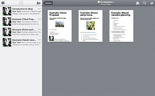 Quip là một phần xử lý văn bản mới kết hợp nhiều chức năng của Google Docs và Pages. Phần mềm hoàn toàn miễn phí, hỗ trợ chạy trên iOS (sắp có cho Android) và trên cả máy tính thông qua trình duyệt web. Quip có giao diện quản lý giống ứng dụng Pages của iPhone, hỗ trợ nhiều người cùng xử lý văn bản cùng lúc giống Google Docs, cho phép chia sẻ văn bản với bạn bè, tạo thư mục nhóm và hỗ trợ làm việc offline không cần kết nối Internet.
