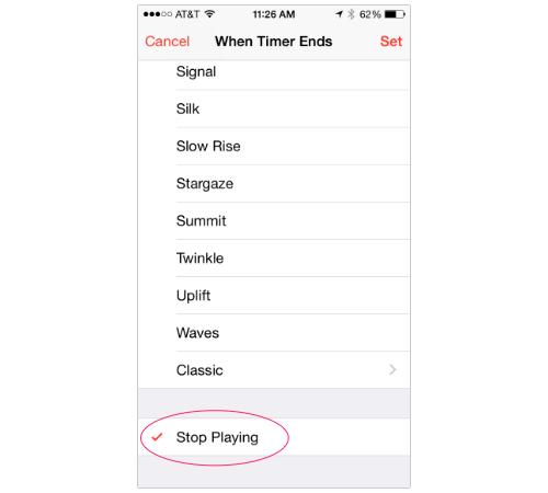 Bước 4: Cuộn xuống phía dưới cùng danh sách và chọn “Stop Playing”. Nhạc sẽ tự động ngừng sau khi hết thời gian.