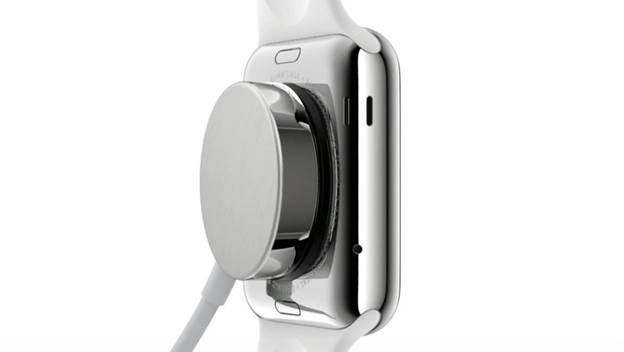 Apple Watch có thiết kế một sạc cảm ứng tròn, dễ dàng kết nối thông qua công nghệ MagSafe (cơ chế tương tự được sử dụng cho Macbook). Sau khi kết nối từ tính vào phía sau của đồng hồ, kết nối được liền mạch và thiết bị được sạc mà không cần điều chỉnh thêm.