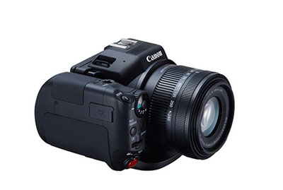 Về mặt ngoại hình thì máy trông khá dị với thiết kệ thân máy hình khối hộp. Phần tay cầm được thiết kế rời để có thể xoay tròn 180 độ. Canon cho biết báng tay cầm này được thiết kế đặc biệt sao cho vừa khít với mọi tư thế cầm của người dùng một cách hoàn hảo. Mặt sau của máy là màn hình LCD 3 inch với độ phân giải 1,030,000 (độ phủ 100%). Canon cũng bổ sung một bộ phóng đại LCD quang học để tăng cường trải nghiệm chụp ảnh. Phía trên chỉ có cổng hot shoe, còn lại tất cả các phím chức năng, bánh xe chỉnh chế độ đều dồn vào phía trên của báng tay cầm. Phần đáy của máy chỉ có cổng gắn chân đế tiêu chuẩn.