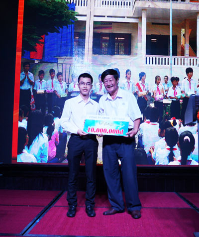 | Đại diện Công ty mPOS Việt Nam trao tượng trưng tiền cho Quỹ học bổng của Hội Tin học tỉnh. |