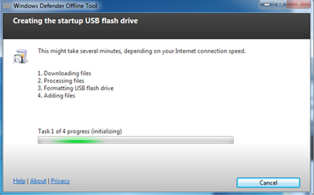 - Bước tiếp theo, trình Windows Defender Offline Tool sẽ tải về những tập tin cần thiết và chép vào USB. Đây là bước quan trọng để công cụ tải về gói cập nhật virus mới nhất nên cần phải có kết nối Internet.