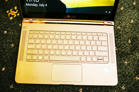 Phần đế bằng carbon nhẹ và không dẫn nhiệt. Mặc dù siêu mỏng, HP Spectre được trang bị cấu hình khủng với chip xử lý Intel Core i7 thế hệ thứ 6, RAM 8 GB và ổng ứng SSD 256 GB chuẩn PCIe có tốc độ cao hơn SATA.
