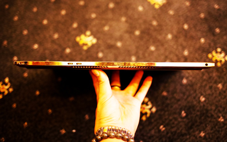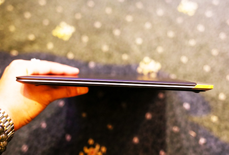 Nhìn từ cạnh bên, máy mỏng hơn do thiết kế vát xéo ở phần viền.
