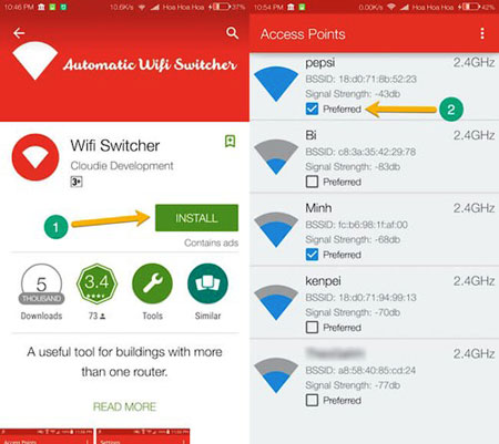 Nếu muốn smartphone tự động phân tích và luôn kết nối với Wi-Fi mạnh nhất, bạn có thể cài đặt ứng dụng Wifi Switcher do Cloudie phát triển, được cung cấp miễn phí tại địa chỉ https://goo.gl/ovz2cL.