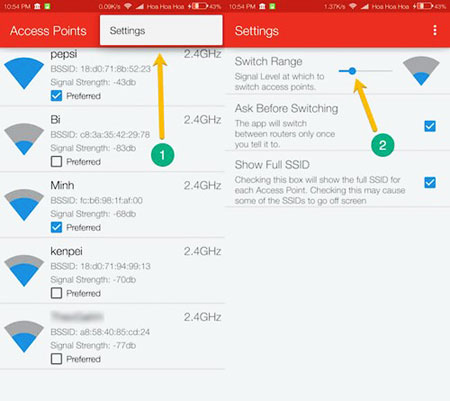 - Bước 3: Nếu muốn thay đổi một số thiết lập, bạn hãy chạm vào biểu tượng ba chấm ở góc trên bên phải và chọn Settings. Tại đây sẽ có 3 lựa chọn gồm Switch Range (ngưỡng tín hiệu cần thiết để thiết bị tự động kết nối Wi-Fi khác, ví dụ như khi tín hiệu mạng chỉ còn một vạch sóng), Ask Before Switching (hỏi trước khi chuyển mạng) và cuối cùng là Show Full SSID (hiển thị đầy đủ tên mạng).