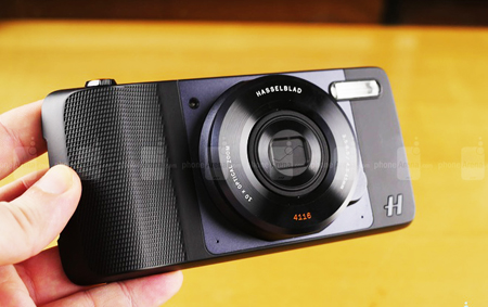 Khi kết hợp, Moto Z Play không còn sử dụng camera 16 megapixel tích hợp sẵn mà chuyển sang dùng máy ảnh 12 megapixel với cảm biến 1/2.3 inch, đèn Flash Xenon trên phụ kiện của Hasselblad. Nó cũng có ống kính cho phép Zoom quang học tới 10x.