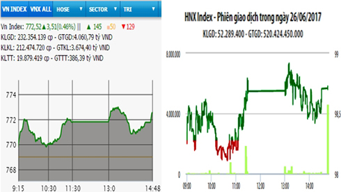 Phiên giao dịch ngày 26-6, sắc xanh chiếm phần lớn thời gian giao dịch, cả hai sàn chứng khoán Hà Nội và TP Hồ Chí Minh cùng tăng điểm. HNX-Index chốt phiên tăng 0,45 điểm, đạt mức 98,73 điểm; VN-Index đóng cửa tăng 3,51 điểm, lên mức 772,52 điểm;