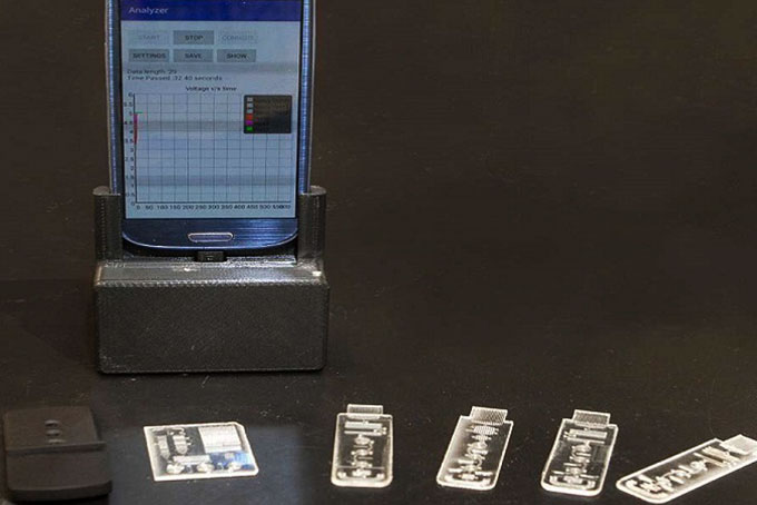 Các kỹ sư ở Đại học Cincinnati thiết kế phòng thí nghiệm di động siêu nhỏ để cắm vào điện thoại thông minh qua cổng USB. Thiết bị đủ nhạy để phát hiện bệnh sốt rét. Nhóm nghiên cứu cho biết sản phẩm rất dễ điều chỉnh theo các dấu hiệu sinh học khác nhau để nhận biết nhiều dịch bệnh khác như HIV, Lyme, virus corona, đồng thời đo lượng hormone liên quan tới căng thẳng, lo lắng và trầm cảm. Người sử dụng chỉ cần nhỏ một giọt máu hoặc nước bọt lên chip thí nghiệm bằng nhựa dùng một lần được thiết kế đặc biệt và nhét vào khe ở thiết bị.