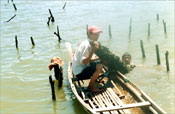 Anh Phạm Văn Ba dặn tôi ngồi bệt xuống chiếc vỉ tre lót dưới thuyền cho thuyền khỏi chòng chành. Nhưng tôi cũng chông chênh theo con thuyền tiến ra vùng biển nuôi vẹm xanh phía trước. Nước triều đang lên, tôi chỉ thấy lô nhô những cọc cắm dưới biển như trận Bạch Đằng năm xưa.