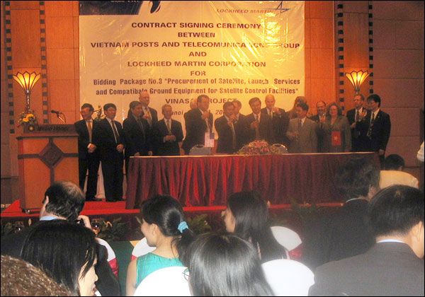 Lễ ký hợp đồng gói thầu số 3 “Cung cấp vệ tinh, dịch vụ phóng, thiết bị trạm điều khiển vệ tinh” thuộc Dự án phóng vệ tinh viễn thông Việt Nam (VINASAT) giữa Tập đoàn Bưu chính Viễn thông Việt Nam (VNPT) và Nhà thầu Lockheed Martin Commercial Space Systems của Mỹ đã diễn ra chiều 12-5, tại Hà Nội.