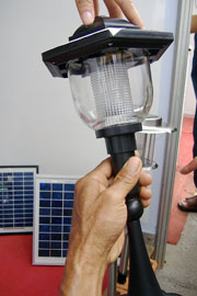 ° Đèn chiếu sáng năng lượng mặt trời ở ngoài vườn: Đây là sản phẩm được Trung tâm Tiết kiệm năng lượng TP. Hồ Chí Minh giới thiệu, chào bán. Ban ngày, pin mặt trời hấp thụ năng lượng mặt trời, buổi tối, bộ phận cảm biến tự động phát sáng. Đèn có kích thước 390mm, tuổi thọ từ 3 đến 5 năm, trên 100.000 giờ; phát ra ánh sáng trắng; mỗi ngày phát sáng từ 8 đến 12 giờ; loại cán bằng nhựa giá 6 USD, loại cán bằng nhôm hoặc inox giá 8,5 USD. Đèn có hình dáng đẹp, dùng để trang trí bằng cách cắm trực tiếp tại sân, vườn hoặc cắm vào các trụ đèn trên sân thượng.