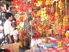Không khí mua sắm đón năm mới Canh Dần càng thêm nhộn nhịp khi nhiều nhà sách, cửa hàng và cả… vỉa hè đua nhau trưng bày các mặt hàng trang trí Tết, với 2 màu đặc trưng là đỏ và vàng (tượng trưng cho hạnh phúc và sự sung túc). Phổ biển nhất là các loại liễn treo trang trí hình đồng tiền vàng, vàng thỏi, liễn nhung đỏ chữ vàng, liễn hình bông hoa mai cỡ lớn, dây treo tràng pháo đỏ… được gắn các câu chúc Vạn sự như ý, An khang thịnh vượng, Cung chúc tân xuân…, giá từ 7 - 15 ngàn đồng/loại nhỏ, 50 - 100 ngàn đồng/loại lớn.