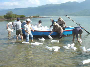 | Thả tôm giống ra đầm Nha Phu để tái tạo nguồn lợi. |
