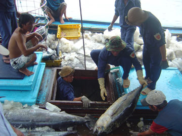 Khánh Hòa hiện có 104 tàu làm nghề câu cá ngừ đại dương (CNĐD), sản lượng khai thác hàng năm đạt từ 1.200 đến 1.500 tấn, thấp hơn nhiều so với tỉnh Phú Yên và Bình Định. Từ đầu năm đến nay, tuy tình hình thời tiết thuận lợi, nhưng sản lượng CNĐD của ngư dân Khánh Hòa chỉ đạt gần 300 tấn, bằng 30% so với kế hoạch năm. Thông thường, ngư trường khai thác cá ngừ nằm vào khoảng từ 400 đến 600 hải lý, thời gian bám biển của ngư dân phải kéo dài từ 20 ngày đến 1 tháng. Chính vì thế, mỗi chuyến tàu loại có công suất từ 90CV trở lên vươn khơi phải hao tổn từ 4.500 đến 5.000 lít dầu, cộng với tiền mua sắm dụng cụ khai thác khơi như: Thẻo câu, lưới, lương thực, thực phẩm thì chi phí cho một chuyến đi biển không dưới 100 triệu đồng, tăng gấp rưỡi so với đầu vụ năm trước… Với giá cá ngừ như hiện nay (100 ngàn đồng/kg), nếu mỗi chuyến tàu khai thác được 1 tấn cá thì chỉ hòa vốn. Do chi phí quá cao, trong khi sản lượng khai thác ngày càng giảm sút nên một số tàu câu CNĐD đã chuyển sang làm nghề lưới vây, lưới cản…