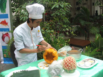 17 giờ cuộc thi mới bắt đầu, nhưng từ 15 giờ, 12 thí sinh tham gia cuộc thi đã có mặt. Mỗi người tự mang theo nguyên vật liệu và tự tay cắt tỉa các loại củ quả để trang trí món ăn. Dưới bàn tay tài hoa của các đầu bếp, những thứ củ quả bình thường trở nên có hồn, góp phần tăng thêm sự hấp dẫn cho món ăn. Đúng 17 giờ, các đầu bếp bắt đầu nổi lửa, và chỉ một thời gian ngắn, các món ăn đã được bày biện tươm tất. 12 đầu bếp với 12 món ăn khác nhau như: Cuốn ba miền, bò lọ lem, cá uyên ương, sò điệp xốt chua ngọt, xôi dừa Nam bộ, lẩu cháo chim bồ câu… đã tạo nên một “bức tranh” ẩm thực rất sinh động. Với món chình um xứ Trầm Hương, đầu bếp Võ Đình Tuấn (Trung tâm dạy nghề Hoa Hướng Dương) chọn quả bí đỏ gọt tỉa thành chiếc âu đựng món ăn rất đẹp mắt. Món cá uyên ương của đầu bếp Đỗ Mạnh Huy (Khu du lịch và Giải trí Diamond Bay) cũng rất bắt mắt với màu sắc, hương vị của cà chua, hành tây, ớt Đà Lạt… Có thể dễ dàng nhận ra hương vị món ăn 3 miền Bắc, Trung, Nam qua cách sử dụng gia vị, bày biện món ăn của các đầu bếp. Màn giao lưu, đố vui về các loại rau, củ, quả trong ca dao dân ca cũng đã góp phần tạo nên không khí cho cuộc thi.
