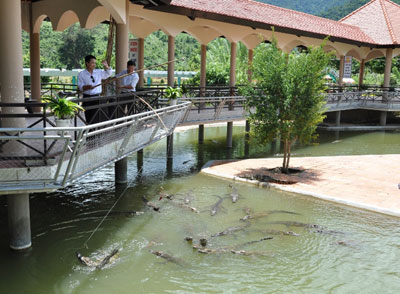 | Câu cá sấu - một trò chơi cho du khách cảm giác mạnh ở Yang Bay. |
