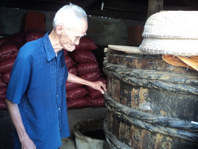 | Ông Phan Tiến Đỉnh bên chiếc thùng gỗ hơn 50 năm đựng nước mắm của gia đình. |