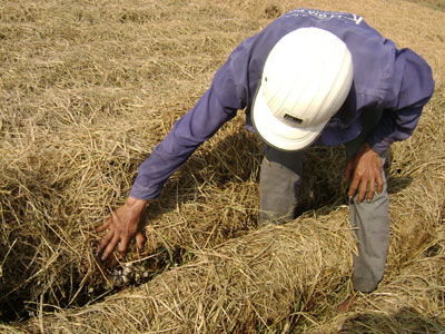 Về Ninh Giang (Ninh Hòa) những ngày này, chúng tôi nhận thấy không khí tất bật chuẩn bị cho vụ sản xuất nấm của người dân nơi đây. Khắp nơi, từ bãi rộng cho đến sân vườn, nông dân trữ rơm rạ để triển khai vụ nấm mới. Khu bãi rộng đi vào thôn Phong Phú 2, nếu dịp Tết Nguyên đán là nơi tập kết hoa, thì nay là cả một “cánh đồng nấm” với bát ngát những vồng rơm nằm ngay hàng thẳng lối. Anh Phạm Ngọc Vương, một nông dân trồng NR chuyên nghiệp cho biết, đây là mùa làm ăn của các hộ dân vì sau vụ thu hoạch lúa, rơm rạ khá nhiều. Rơm sau khi được đưa về đem ủ, trộn đảo vài lần để đạt độ “chín” cần thiết (cuốc ra thấy đỏ, hoai mục), 5 ngày sau là bắt đầu sản xuất. Đưa rơm chín vào các hộc gỗ (kích thước 1,5m x 0,2m x 0,23m), lèn chặt, cứ một lớp rơm rắc một lớp meo giống (cấy giống), làm thành vài lớp, xong đem ra xếp thành hàng tạo vồng, trên rắc một lớp rơm khô, rồi đốt để kích thích meo nấm phát triển (bình quân 1,2 - 1,3 gói meo/hộc). Sau đó, tiếp tục rắc thêm lớp rơm để giữ ẩm. Hàng ngày, tùy theo thời tiết, tưới lượng nước thích hợp để duy trì độ ẩm cho các vồng rơm. Sau 5 ngày, các vồng rơm bắt đầu cho kết quả và công việc thu hái bắt đầu. Một chu kỳ sản xuất NR chỉ mất 10 - 12 ngày. Nếu thời tiết thuận lợi, 1 hộc cho 1kg nấm. Hiện giá nấm đạt 35 - 40 ngàn đồng/kg, nguồn lợi đem lại là không nhỏ cho những hộ sản xuất nhiều, với vài ngàn hộc mỗi đợt. Anh Vương cho biết thêm, nơi đất rút nước tốt (đất mới nâng) sản xuất nấm rất hiệu quả, bình quân 1 hộc cho 1kg nấm. Theo anh, nếu có rơm dồi dào thì không gì bằng sản xuất nấm.