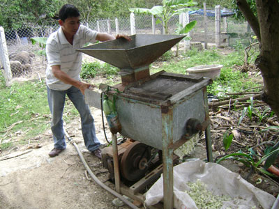 | Ông Long với chiếc máy xắt chuối, rau đa năng. |