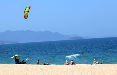 | Khách chơi ván buồm trên vịnh Nha Trang. |