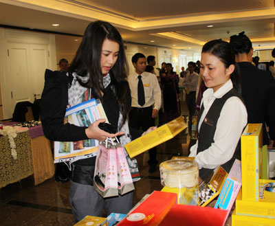 | Các doanh nghiệp Khánh Hòa giới thiệu sản phẩm tại lễ ký kết hợp tác du lịch Khánh Hòa - Lâm Đồng. |