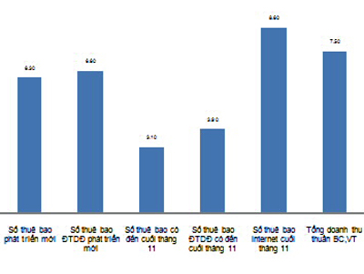 | Tốc độ tăng một số chỉ tiêu bưu chính, viễn thông chủ yếu trong 11 tháng năm 2012 (%). Nguồn: Tổng cục Thống kê |