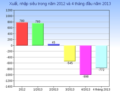 Nhập siêu trong tháng 3 và tháng 4 đã trở lại với quy mô không nhỏ. Tính chung 2 tháng 3 và 4, so với cùng kỳ năm trước xuất khẩu chỉ tăng 12,8%, thấp hơn nhiều so với tốc độ tăng trong 2 tháng đầu năm (22%), trong khi nhập khẩu tăng tới 28,9%, cao gấp rưỡi tốc độ tăng trong 2 tháng đầu năm (14,1%) và cao hơn nhiều so với tốc độ tăng của xuất khẩu. Hai tháng đầu năm 2013, Việt Nam xuất siêu 821 triệu USD, nhưng sang tháng 3 và 4 nhập siêu lên đến 1.543 triệu USD, tính chung 4 tháng đầu năm đã nhập siêu 722 triệu USD.