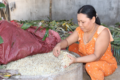 Chị Võ Thị Ánh Hoa (tổ dân phố 13, phường Ninh Hiệp) cho biết: “Nghề làm giá ở đây có từ rất lâu. Thời ông bà, cha mẹ của tôi đã làm nghề này, bây giờ đến đời tôi tiếp tục kế thừa. Làm giá là nghề giúp mọi người thoát nghèo”. Tận dụng khoảng đất trống hơn 30m2 trong vườn, chị Hoa đặt 20 lu đúc bằng xi măng có đường kính 1m, cao 50cm để ủ giá. Theo chị Hoa, để làm ra những cọng giá sạch, đầu tiên phải chọn đậu xanh có chất lượng tốt nhất, đồng thời phải chọn mua cát sạch ở vùng biển Ninh Diêm hoặc Ninh Hải. Cát mua về được sàng loại bỏ rác và sỏi để lấy cát mịn ủ giá. Cát ủ giá chỉ sử dụng 1 lần, nếu sử dụng lại lần 2, đậu sẽ không nảy mầm. Chị đem trộn đều theo tỷ lệ 1kg đậu xanh với 5kg cát, rồi cho vào lu xi măng ủ, mỗi ngày tưới nước sạch từ 4 đến 5 lần. Sau 4 ngày ủ là có thể thu hoạch. Chị Hoa cho biết, 1kg hạt đậu xanh sẽ cho 8kg giá. Trung bình mỗi ngày, gia đình chị sản xuất 100 - 150kg giá. Hiện nay, giá được bán 8.000 đến 10.000 đồng/kg. Trừ chi phí, mỗi ngày, gia đình chị thu lời từ 150.000 đến 200.000 đồng.