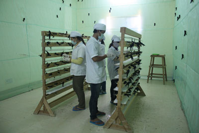 | Các kỹ thuật viên chăm sóc chim yến con. |