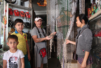 | Du khách Nga mua mành ốc - một sản phẩm độc đáo của các cơ sở sản xuất mành ốc ở phường Vĩnh Nguyên, TP. Nha Trang. |
