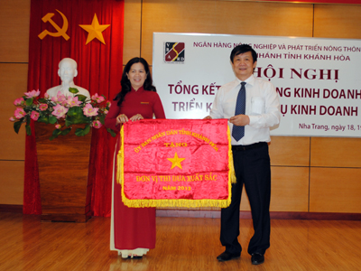 Ông Trần Sơn Hải tặng cờ thi đua xuất sắc của UBND tỉnh Khánh Hòa cho Agribank Chi nhánh Vạn Ninh. |