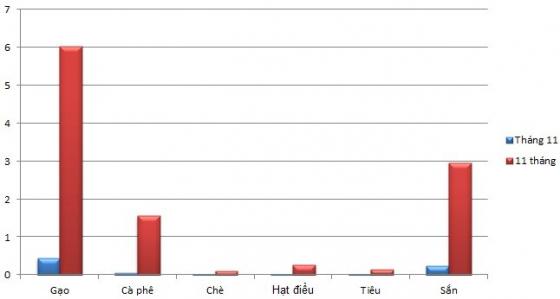 Tổng giá trị xuất khẩu 6 mặt hàng nông sản chính tháng 11 và 11 tháng năm 2014