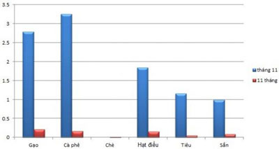 Giá trị xuất khẩu các mặt hàng nông sản chính 11 tháng đầu năm 2014 ước đạt 13,19 tỷ USD, tăng 10,5% so với cùng kỳ năm 2013