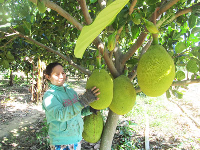 Vài năm gần đây, do yêu cầu lập vườn, đồng thời cây mít nghệ và bưởi da xanh có giá, thị trường ưa chuộng nên ông bà quyết định đưa mít, bưởi vào trồng. Hiện nay, vườn mít đã có 200 gốc, trong đó có 100 gốc đang ra trái bói; còn vườn bưởi 200 cây cũng gần đến giai đoạn cho quả. Theo bà Cúc, mỗi năm, vườn mít cho thu hoạch khoảng 3 tấn quả. Với giá bán bình quân 10.000 đồng/kg, vườn mít cho thu nhập 30 triệu đồng/năm...