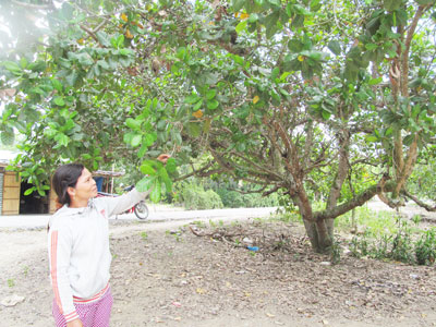 Gia đình bà Cao Thị Sên (thôn Đá Trắng, xã Cầu Bà, huyện Khánh Vĩnh, Khánh Hòa) là một trong những hộ trồng điều nhiều nhất tại thôn với 4ha, tuy nhiên, sản lượng điều năm nay quá thấp. “2ha điều tôi trồng ở Khánh Nam mất mùa, không hái được trái nào, 2ha điều ở Apan thì vớt vát chút đỉnh, chỉ đủ tiền gạo, chi tiêu cho cả nhà. Cả vụ chỉ kéo dài đúng 3 tuần”, bà Sên nói. Bà so sánh, mùa điều năm ngoái tuy nắng hạn, mất mùa nhưng bà thu hoạch được 4 tấn, năm nay chỉ được vài tạ.