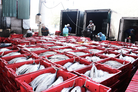 | Cá ngừ sọc dưa được thu mua, chờ đưa về nhà máy chế biến |