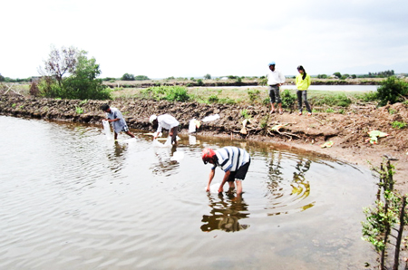 | Thả tôm giống thực hiện mô hình nuôi tôm theo quy trình VIETGAP tại xã Cam Hòa |