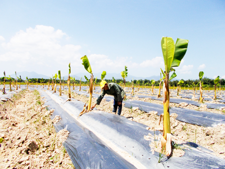 Trên những diện tích trồng mì kém hiệu quả, nông dân xã Suối Tiên (huyện Diên Khánh, Khánh Hòa) đã chuyển đổi sang các loại cây trồng khác, trong đó phương pháp trồng chuối phủ bạt được áp dụng và đem lại thu nhập cao.