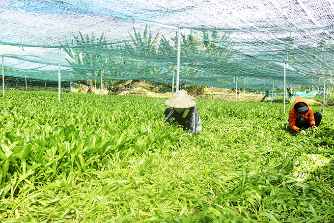Vườn ngò gai có diện tích hơn 1.600m2 (hơn 4 sào) của gia đình ông Nguyễn Phương (thôn 1) đang chuẩn bị cho thu hoạch. Ông Phương cho biết, trước đây, gia đình ông trồng bắp, hoa màu nhưng hiệu quả kinh tế không cao. Cách đây 5 năm, ông chuyển sang trồng thử cây ngò gai. Từ khi xuống giống cho đến lúc thu hoạch chỉ mất hơn 3 tháng. Sau đó, cứ 30 ngày thu hoạch lứa tiếp theo, bình quân ông Phương thu được khoảng 400kg/lứa, thu hoạch liên tục trong 4 - 5 tháng. Với giá bán 16.000 đồng/kg, trừ chi phí đầu tư (khoảng 15 triệu đồng/sào), mỗi sào ông lãi khoảng 10 - 15 triệu đồng, nhiều gấp đôi so với trồng bắp. Thấy hiệu quả, hàng năm, ông mở rộng diện tích trồng ngò gai và thuê thêm đất để trồng. Đến nay, gia đình ông có hơn 1,5ha đất trồng ngò gai. Do gia đình ông trồng với diện tích lớn nên chia ra từng lô, vài tuần lại có một đám cho thu hoạch. Hiện nay, thương lái tới tận vườn thu hoạch với giá 17.000 - 18.000 đồng/kg; gia đình tự bán giá 22.000 đồng/kg. Ngò gai ưa bóng râm nên phải làm giàn lưới chống nắng. Tuy đầu tư ban đầu cao nhưng cho thu nhập ổn định. Ngò gai trồng trong 1 năm phải phá bỏ để cải tạo lại đất 1 lần hoặc có thể trồng cây khác sau một thời gian mới trồng lại, vì nếu đất quen, ngò gai sẽ phát triển kém, năng suất giảm, nhiều sâu bệnh.